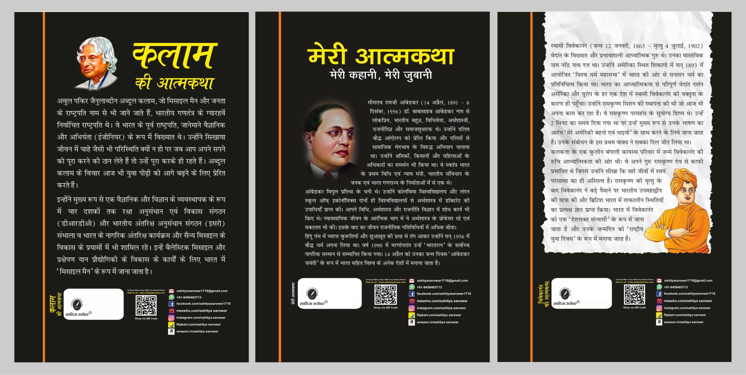 This combo set includes three inspiring autobiographical books based on the lives of A. P. J. Abdul Kalam, B. R. Ambedkar, and Swami Vivekananda, offering powerful lessons of success, struggle, and self-development. The book “Kalam Ki Atmakatha” presents the life journey of Dr. Kalam, highlighting his rise from humble beginnings to becoming one of India’s most respected scientists and former President. “Meri Atmakatha: Meri Kahani Meri Jubani” reflects Dr. Ambedkar’s life experiences, struggles, and achievements, showcasing his journey as a social reformer and nation-builder. “Vivekananda Ki Atmakatha” highlights the inspiring life, teachings, and philosophy of Swami Vivekananda, focusing on spirituality, self-confidence, and service to humanity. Written in simple and easy Hindi, this combo set is ideal for students, young readers, and anyone seeking motivation and inspiration from great Indian personalities.
