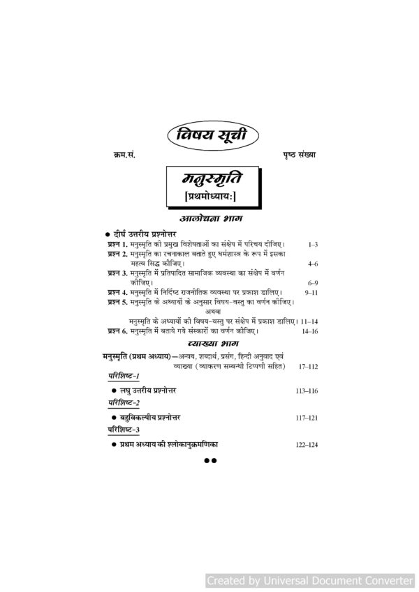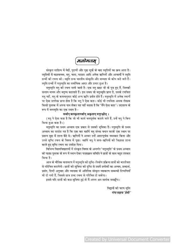 Manusmriti (First Chapter), composed by Acharya Manu, is one of the most influential texts of ancient Indian literature, philosophy, and law. This edition presents the original Sanskrit shlokas along with word-to-word meanings (shabdarth), Hindi translation, contextual explanations, and grammar notes, making it a valuable resource for students, researchers, and seekers of Indian knowledge traditions.