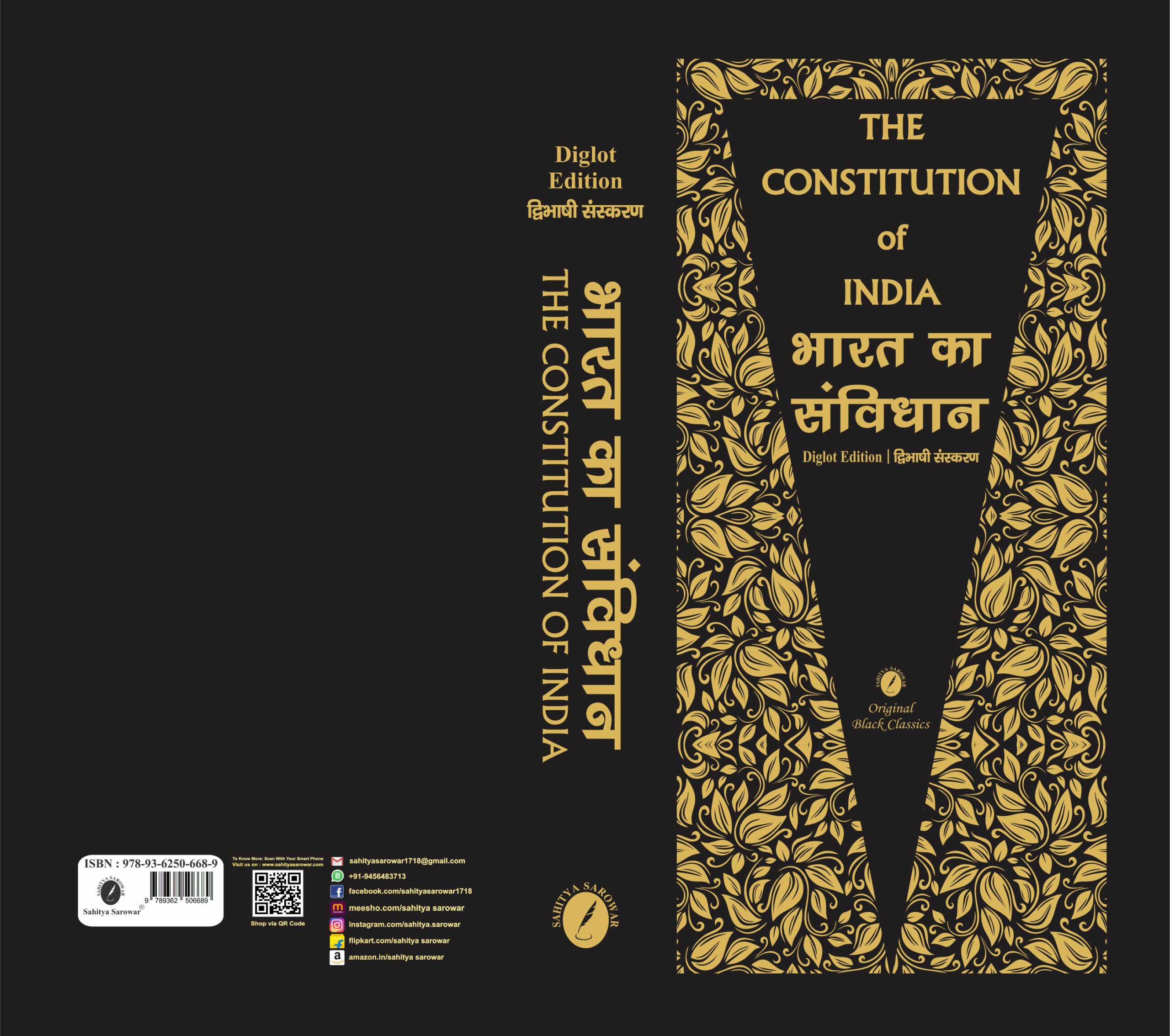 The Constitution of India & Bharat Ka Samvidhan – Diglot Edition (English–Hindi), Pocket Size – Black Cover Edition presents the complete and authentic text of the Indian Constitution in a compact, bilingual format. This edition features a classic black cover, giving it a formal, professional, and official appearance suitable for academic and institutional use.